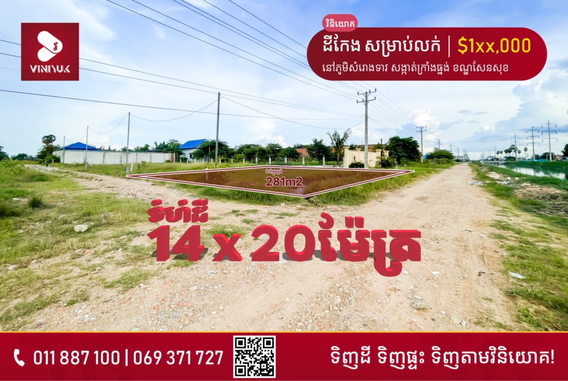 ដីកែង 14m X 20m ជាប់ប្រឡាយ 40m